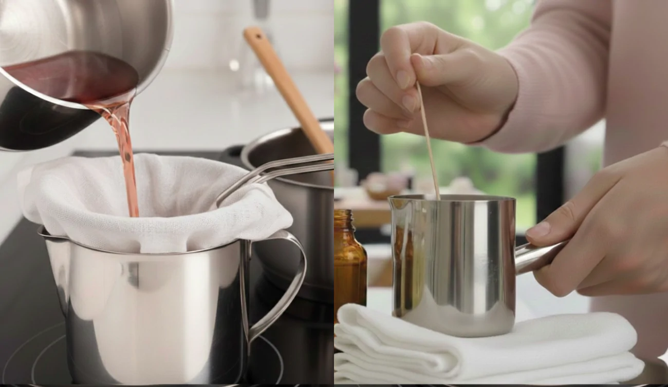 Take any soft clean cloth available and pour the wax in a container to remove any dust. Add desired fragrance based on your scent requirement. Keep stirring till its aroma blends with the molten soy wax.