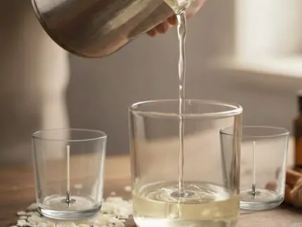 Till wax cools a little more, clean the container and place cotton wick in the center of the glass jar. Then start pouring molten soy wax. Use a wick stabiliser to ensure the wick stays in the center.